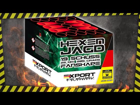 Hexenjagd, 19 schuss 25mm Batterie. Hexenjagd is een fantastische siercake uit de EXPORTmeister serie met Duits vuurwerk. Een goede 19 schuss cake met 25mm tubesize voor goede siereffecten. Deze Hexenjagd schiet zijn effecten zowel in i-shape als in fan-shape.